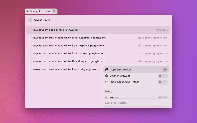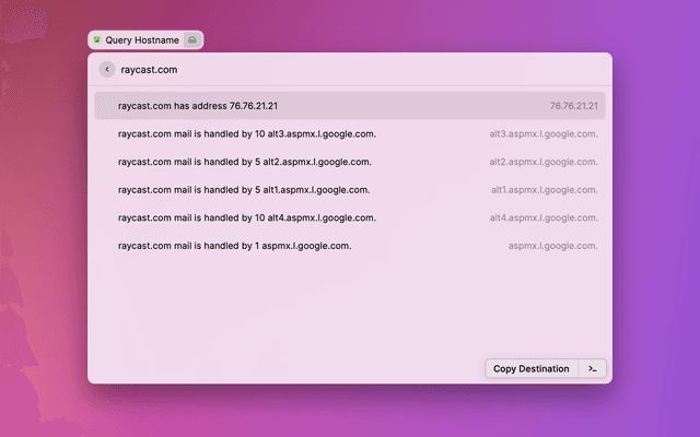 DNS lookup and nameserver query using the built-in host command on macOS. Built for Raycast.
